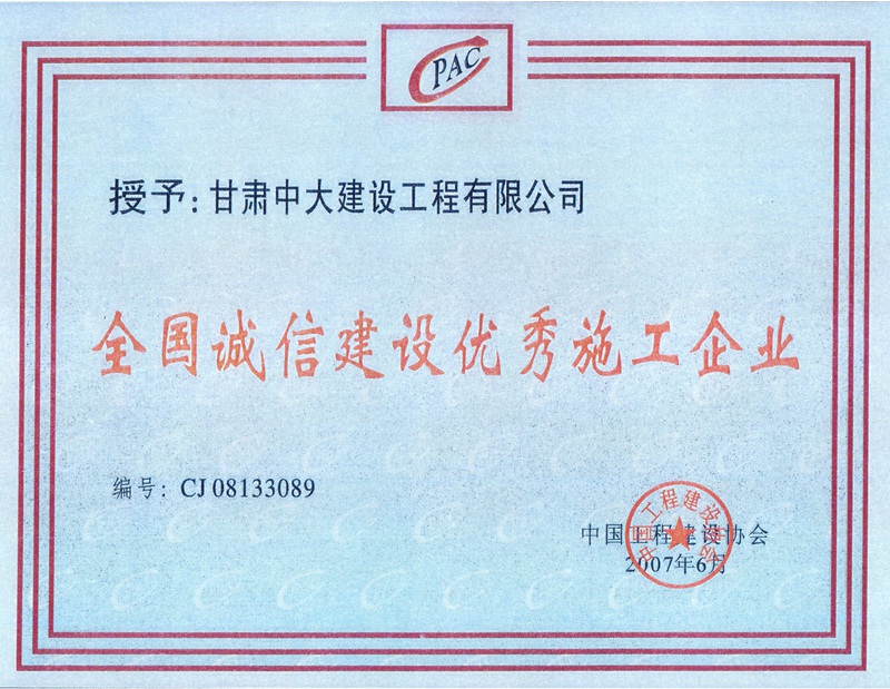 全国诚信建设优秀施工企业奖